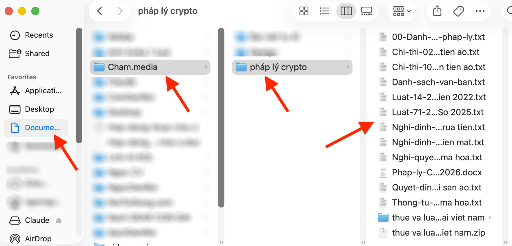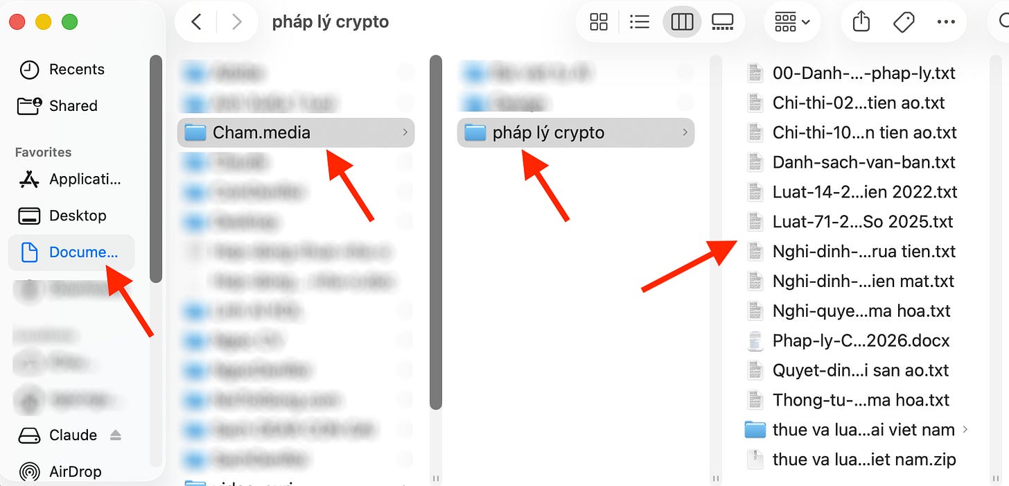 Kết quả khi tôi trở lại máy tính thì Claude đã làm xong việc đúng như tôi yêu cầu, tức là tìm kiểm đủ các văn bản pháp lý, lưu về đặt tên file, tạo mới một thư mục “pháp lý crypto” trong thư mục “cham.media”. Nó còn tạo một file riêng tổng hợp danh sách 7 văn bản pháp lý bao gồm mô tả đó là gì, ý chính của văn bản, nguồn…