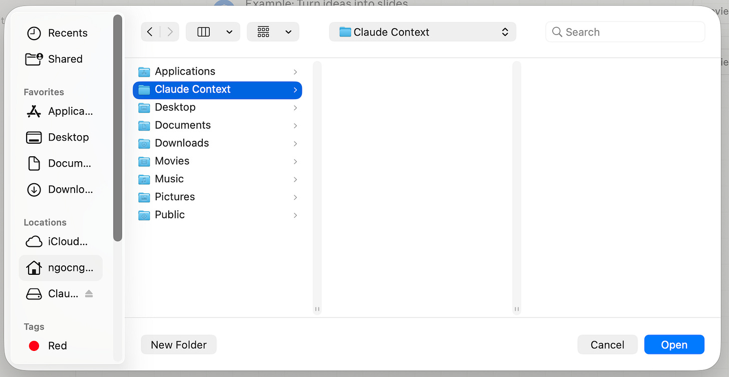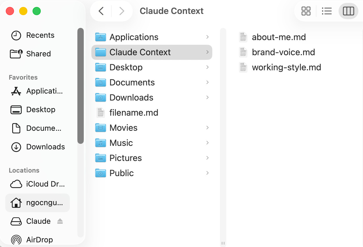 Theo tôi bạn nên tạo một thư mục riêng tên “Claude Context” hoặc “AI Workspace” để chứa tất cả các file mà Claude sẽ đọc và tạo ra. Điều này giúp bạn kiểm soát dễ dàng hơn những gì Claude có quyền truy cập.