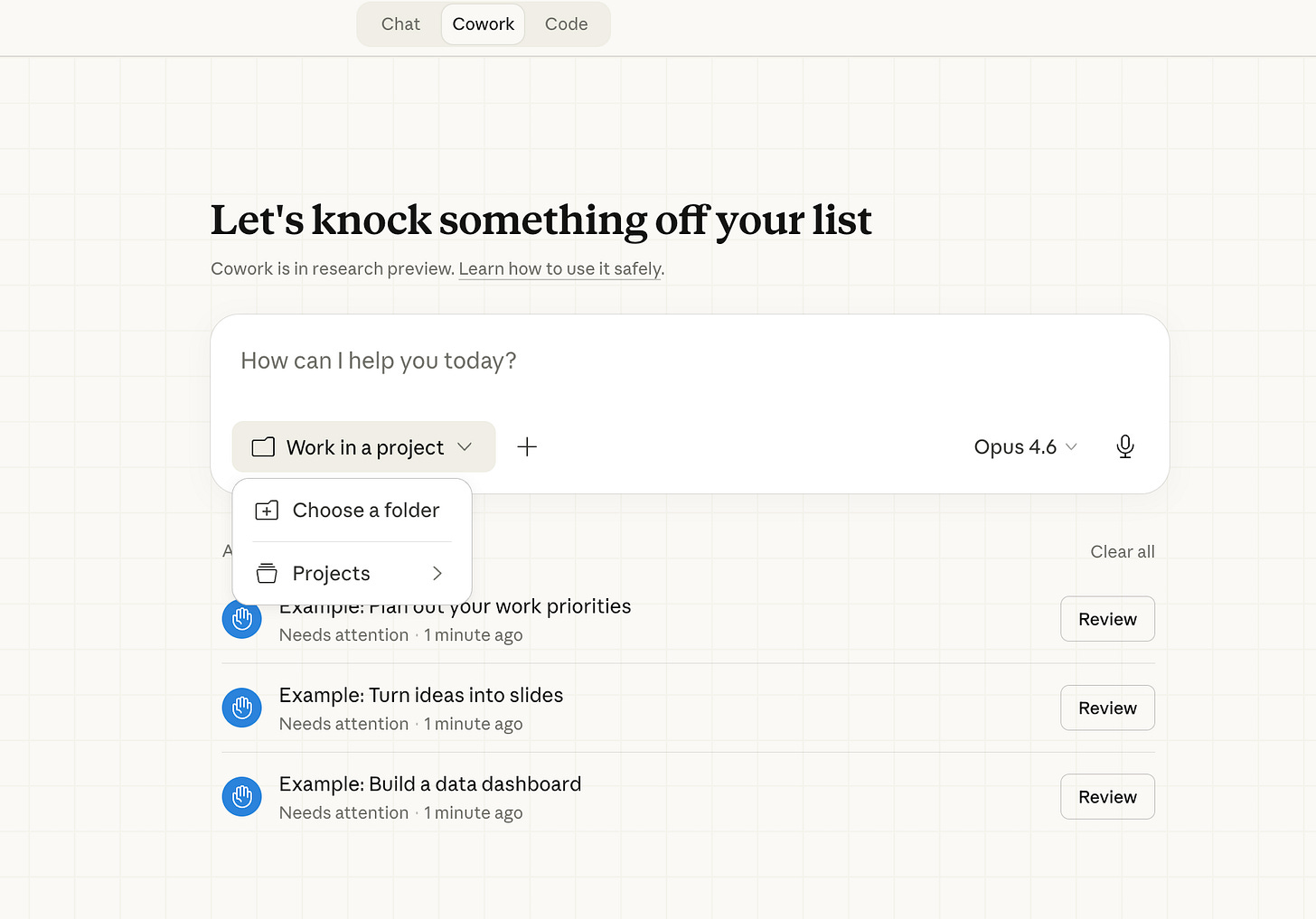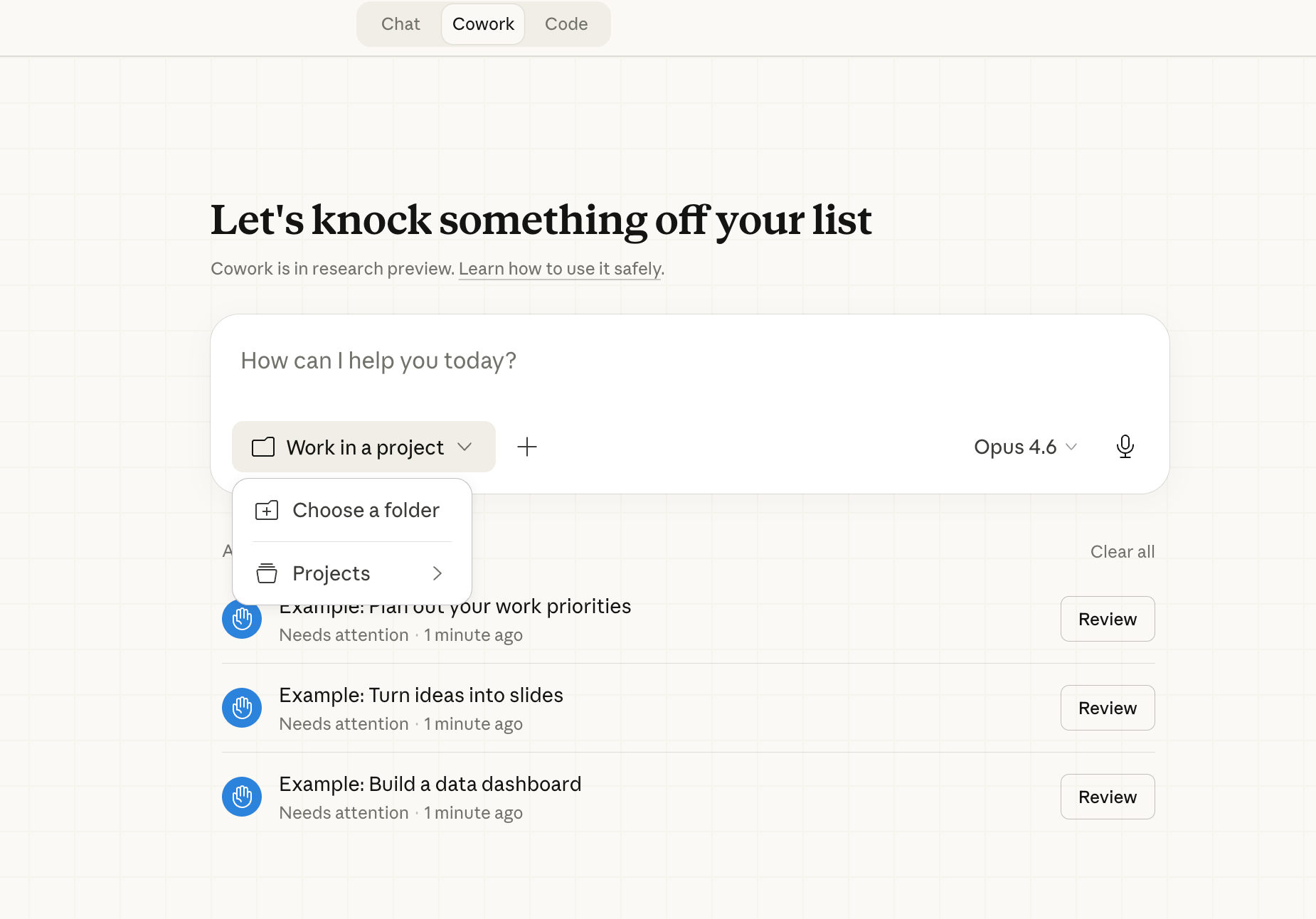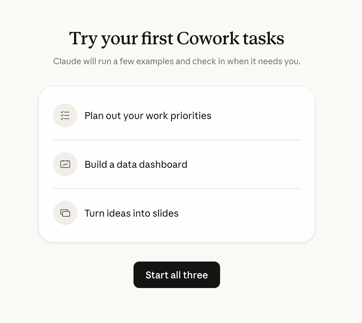 Bạn có thể nhấn “Start all three” để Claude thực hiện cả ba tác vụ mẫu này - đây là cách nhanh nhất để xem Claude Cowork hoạt động như thế nào. Hoặc bỏ qua và bắt đầu với tác vụ của riêng bạn.