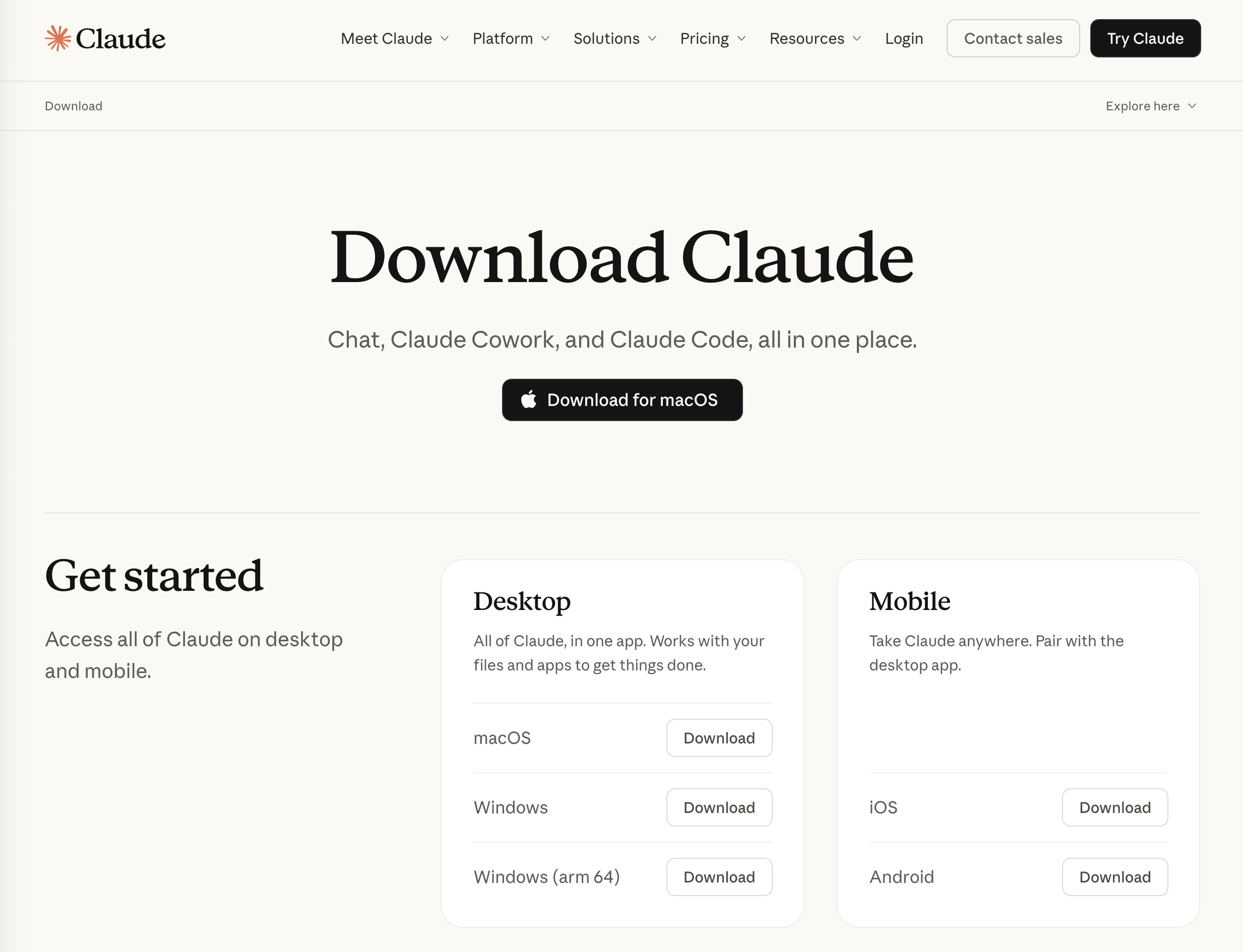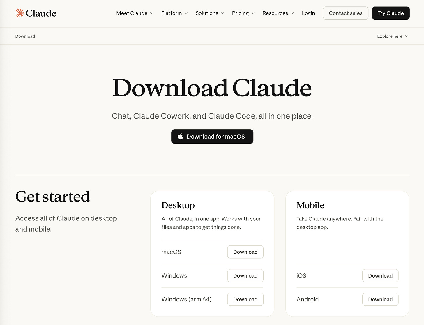 Trước tiên, hãy truy cập trang claude.ai/download. Bạn sẽ thấy các tùy chọn tải về.