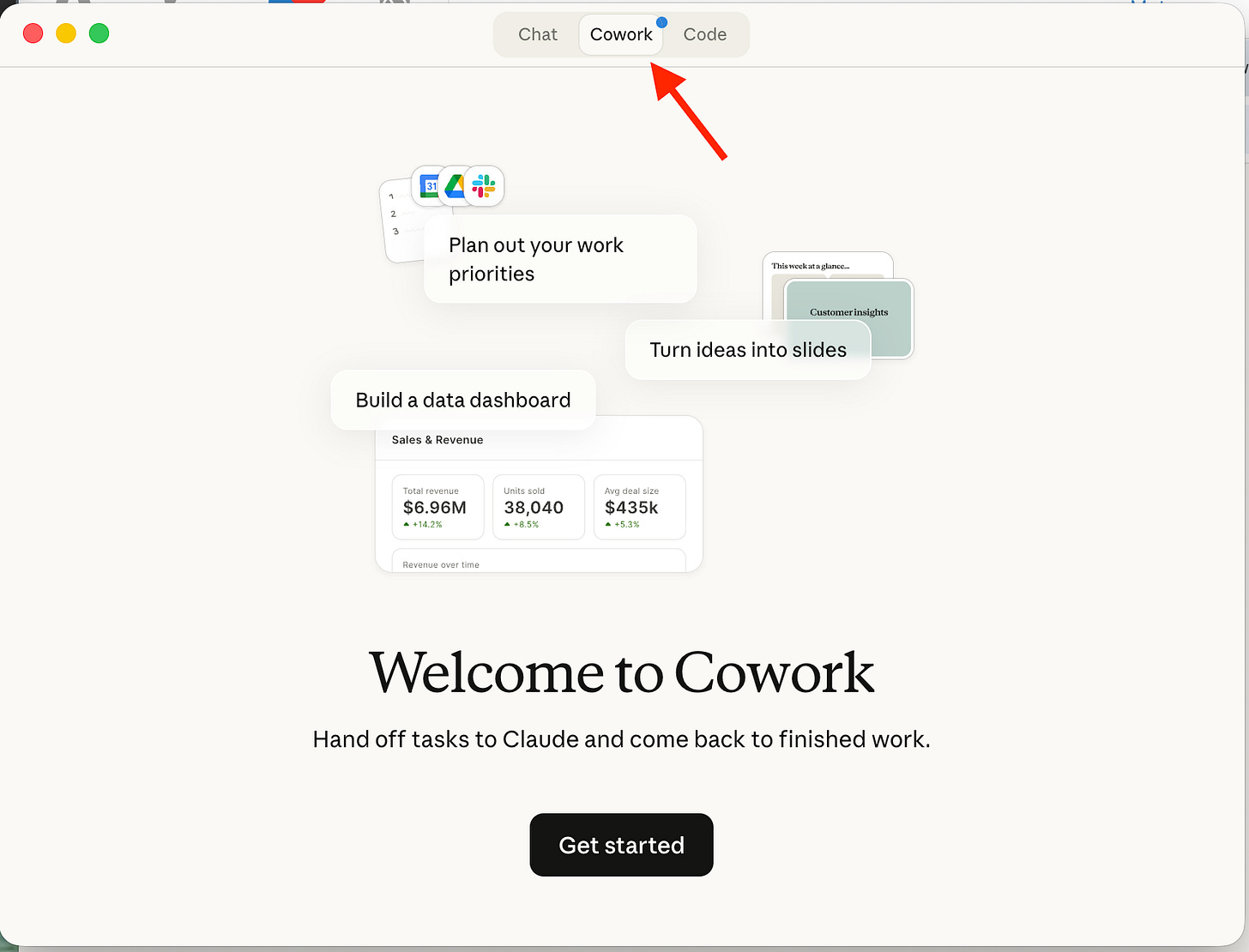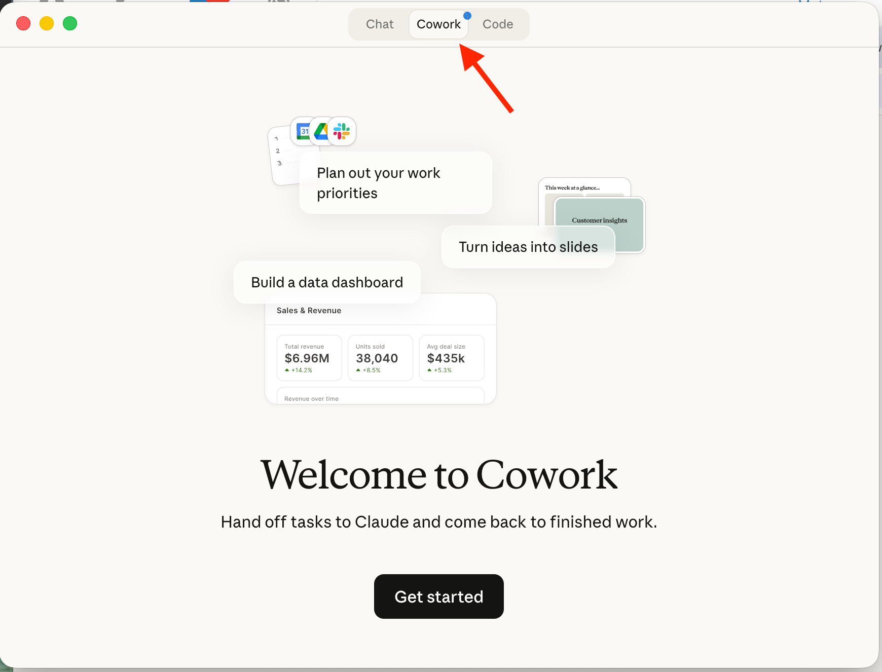 Sau khi đăng nhập, ứng dụng sẽ giới thiệu bạn với giao diện Cowork qua ba tác vụ mẫu:
