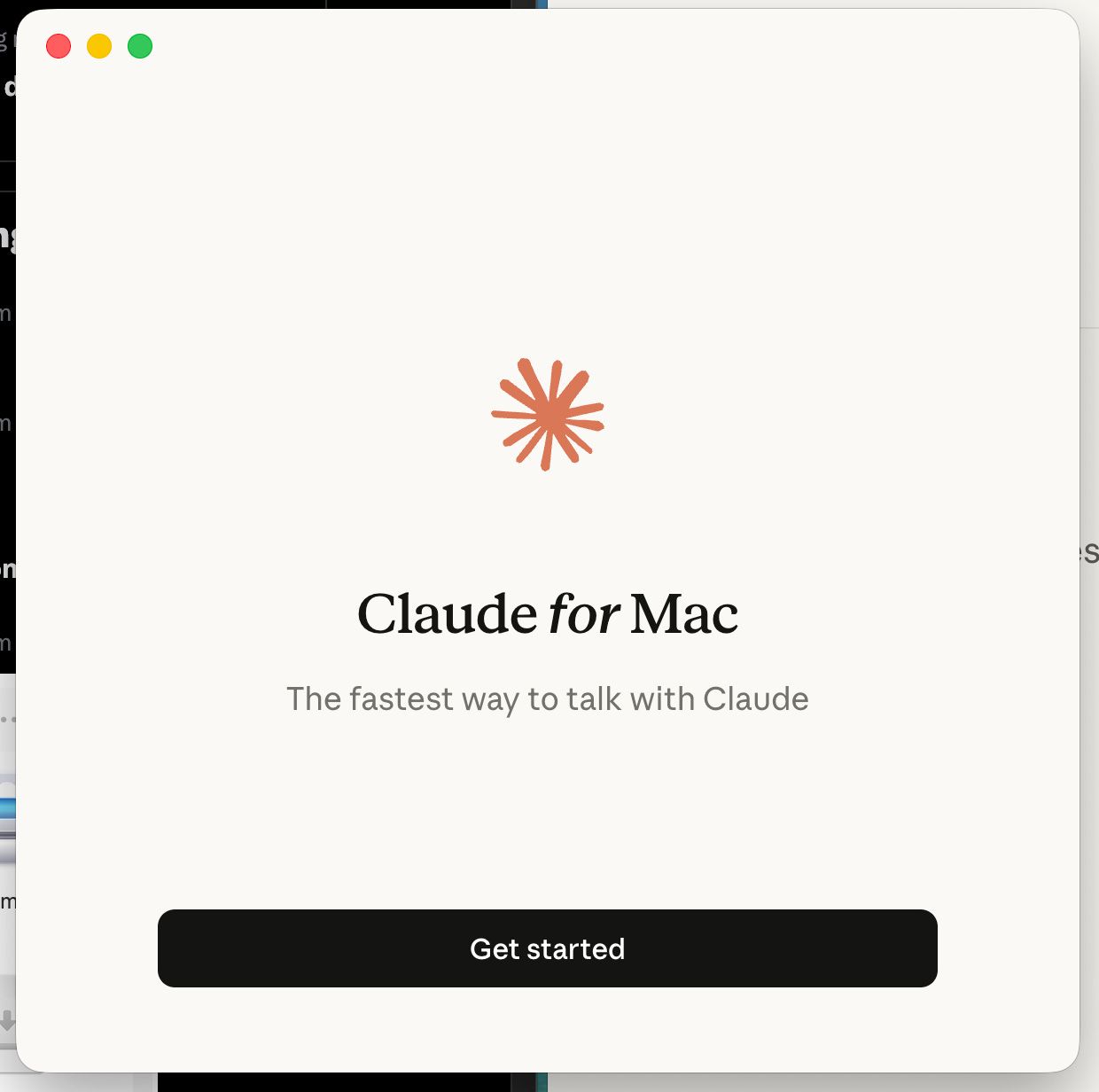 Sau khi cài xong, mở ứng dụng Claude. Lần đầu tiên, bạn sẽ thấy màn hình chào mừng với logo Claude và nút “Get started”. Giao diện thiết kế đơn giản, tối giản — rất dễ chịu khi nhìn vào.