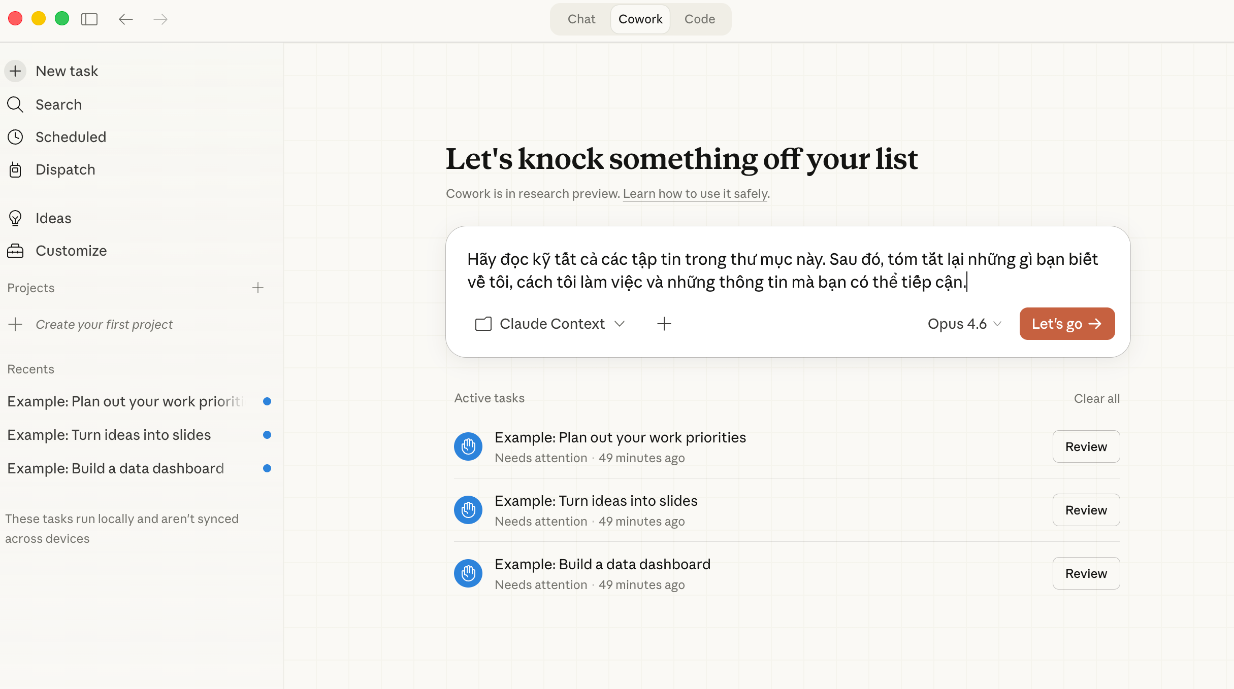 Claude Cowork thường hỏi bạn review kết quả trước khi hoàn tất (bạn thấy nút “Review” trong màn hình tác vụ). Hãy tận dụng điều này - đọc qua kết quả, góp ý nếu cần chỉnh sửa. Vài vòng phản hồi sẽ cho bạn kết quả tốt hơn nhiều so với chạy một lần.