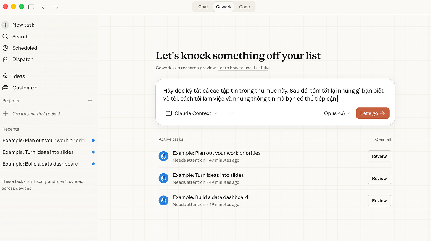 Từ đoạn này chúng ta sẽ chỉ tập trung vào Claude Cowork