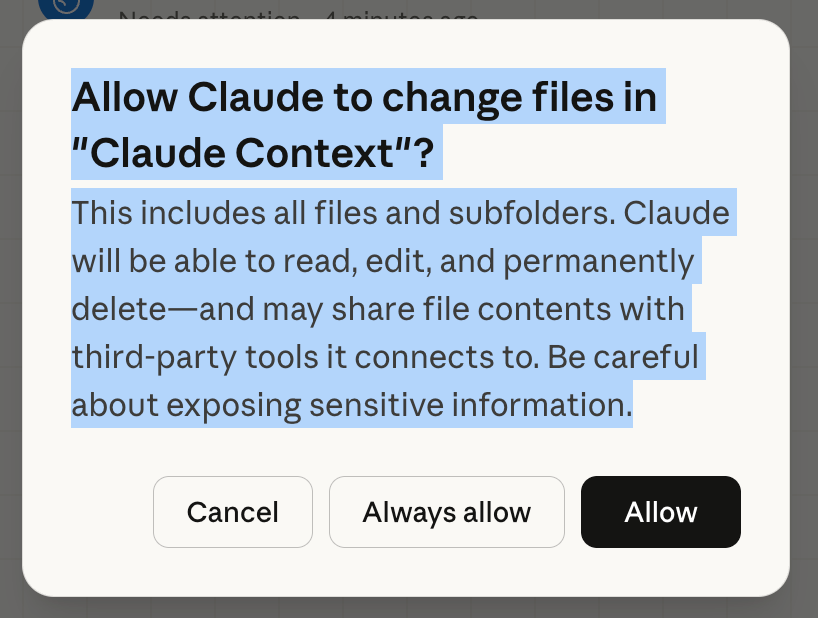 Sau khi chọn thư mục, ứng dụng sẽ hỏi bạn: “Allow Claude to change files in [tên thư mục]?”. Đây là bước bảo mật quan trọng.