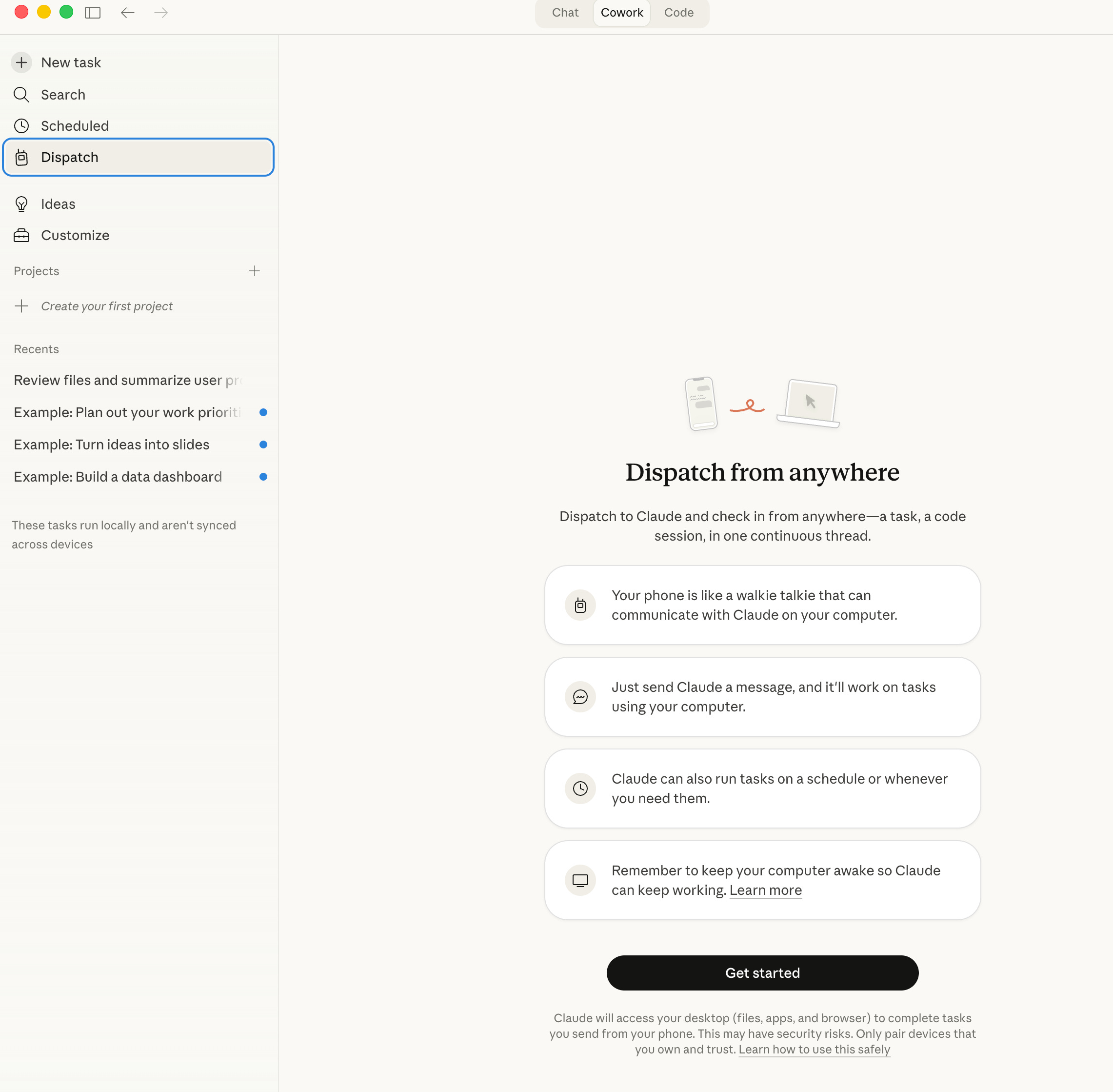 Tính năng Dispatch cho phép bạn giao việc cho Claude từ điện thoại trong khi Claude thực hiện công việc trên máy tính để bàn của bạn. Đây là tính năng cực kỳ tiện lợi - bạn đang đi uống cà phê, nhớ ra cần làm một báo cáo, chỉ cần nhắn tin cho Claude và nó sẽ làm xong khi bạn về đến nhà.