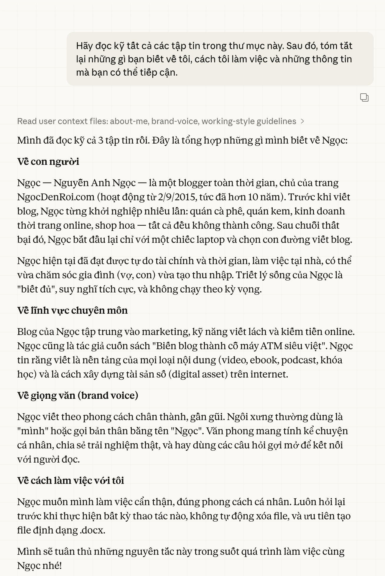 Khi Claude đọc các file này, nó sẽ hiểu rõ bạn hơn và tạo ra nội dung phù hợp hơn với phong cách của bạn ngay từ lần đầu - không cần giải thích lại mỗi lần. Đây là lý do mà nhiều bạn dùng AI thấy hiệu quả còn nhiều bạn lại thấy… vớ vẩn.