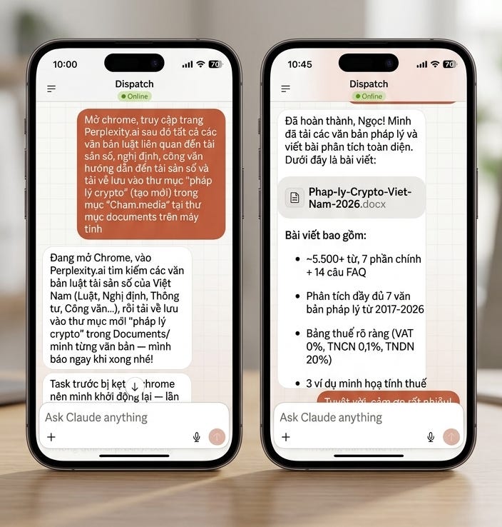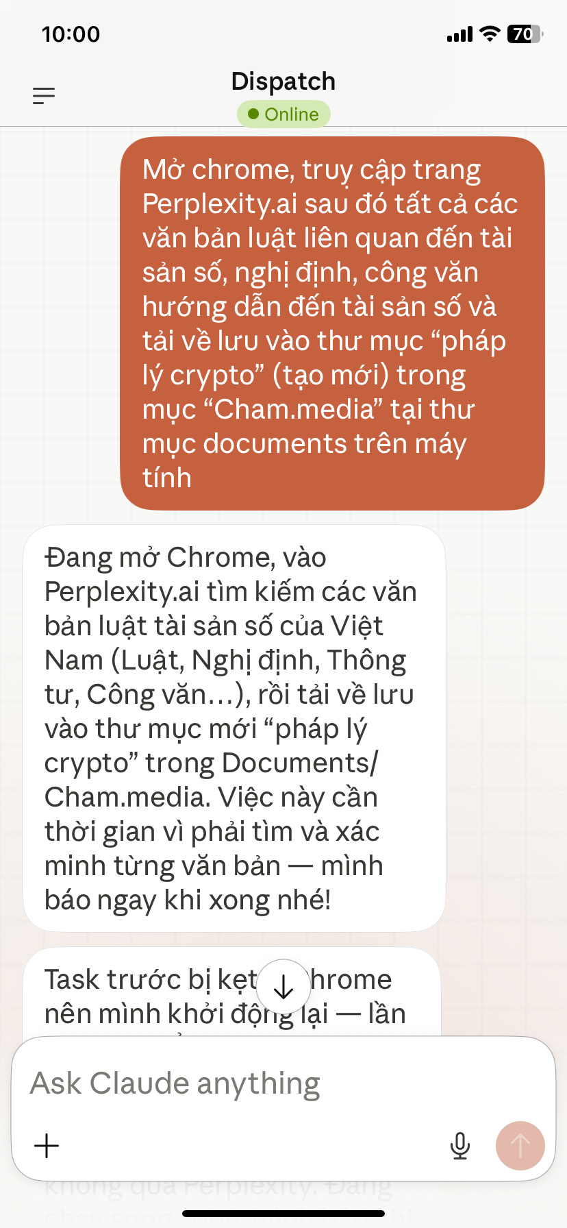 Cụ thể tôi đã mở app Claude, vào tính năng Dispatch & nhắn: Mở chrome, truy cập Perplexity.ai (công cụ AI chuyên research thông tin) sau đó tìm tất cả các văn bản luật liên quan đến tài sản số, nghị định, công văn hướng dẫn đến tài sản số và tải về lưu vào thư mục “pháp lý crypto” (tạo mới) trong mục “cham.media” tại thư mục documents trên máy tính”