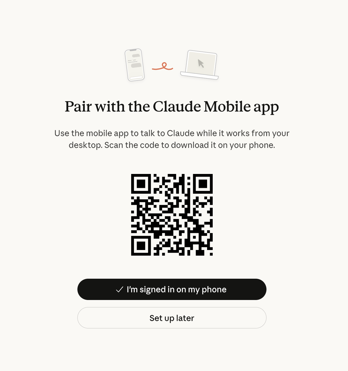 Sau khi thiết lập xong trên máy tính, bạn có thể kết nối thêm điện thoại để sử dụng tính năng Dispatch. Quét QR code trong ứng dụng để tải Claude mobile, sau đó đăng nhập cùng tài khoản.