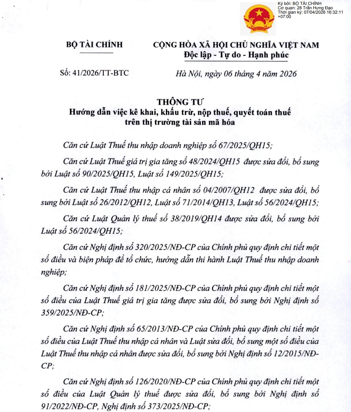 Ngày 6/4/2026, Bộ Tài chính đã trả lời bằng Thông tư 41.