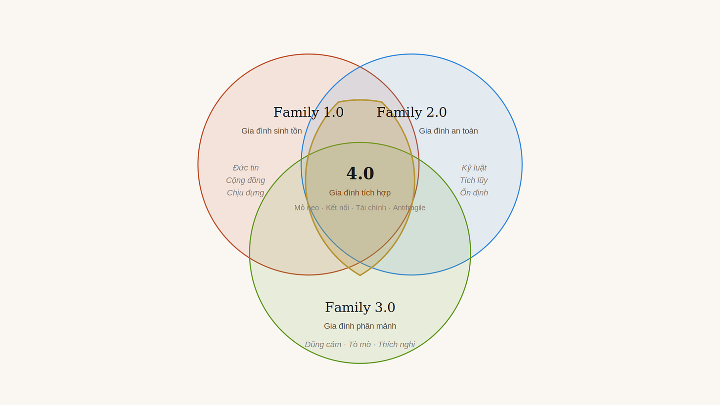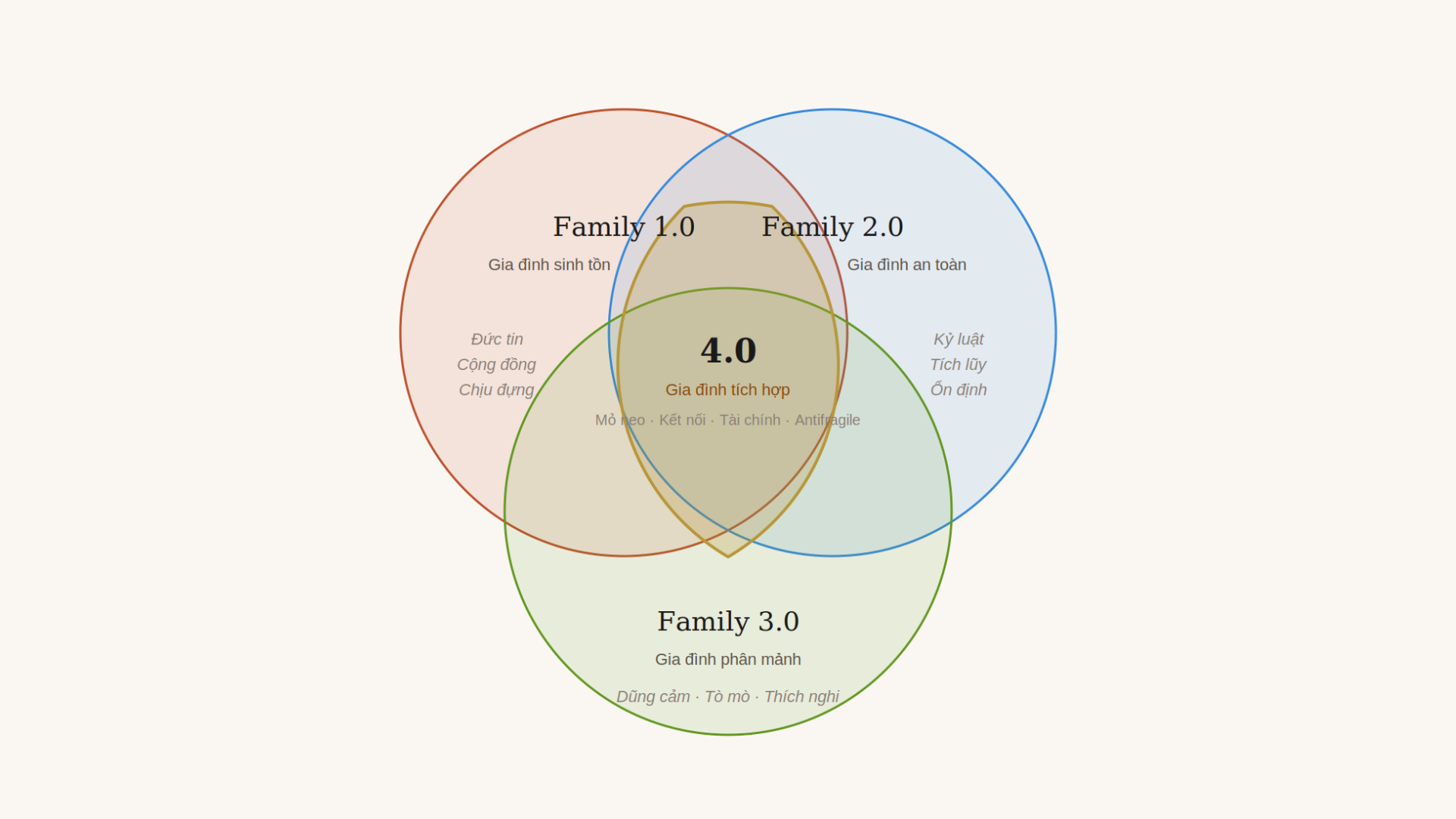 Family 4.0 không xóa bỏ quá khứ. Nó là tích hợp tất cả - sự chịu đựng và đức tin của 1.0, sự ổn định và kỷ luật của 2.0, sự dũng cảm và tò mò của 3.0 - rồi thêm vào những thứ mà thời đại mới đòi hỏi cần phải học liên tục, suốt đời