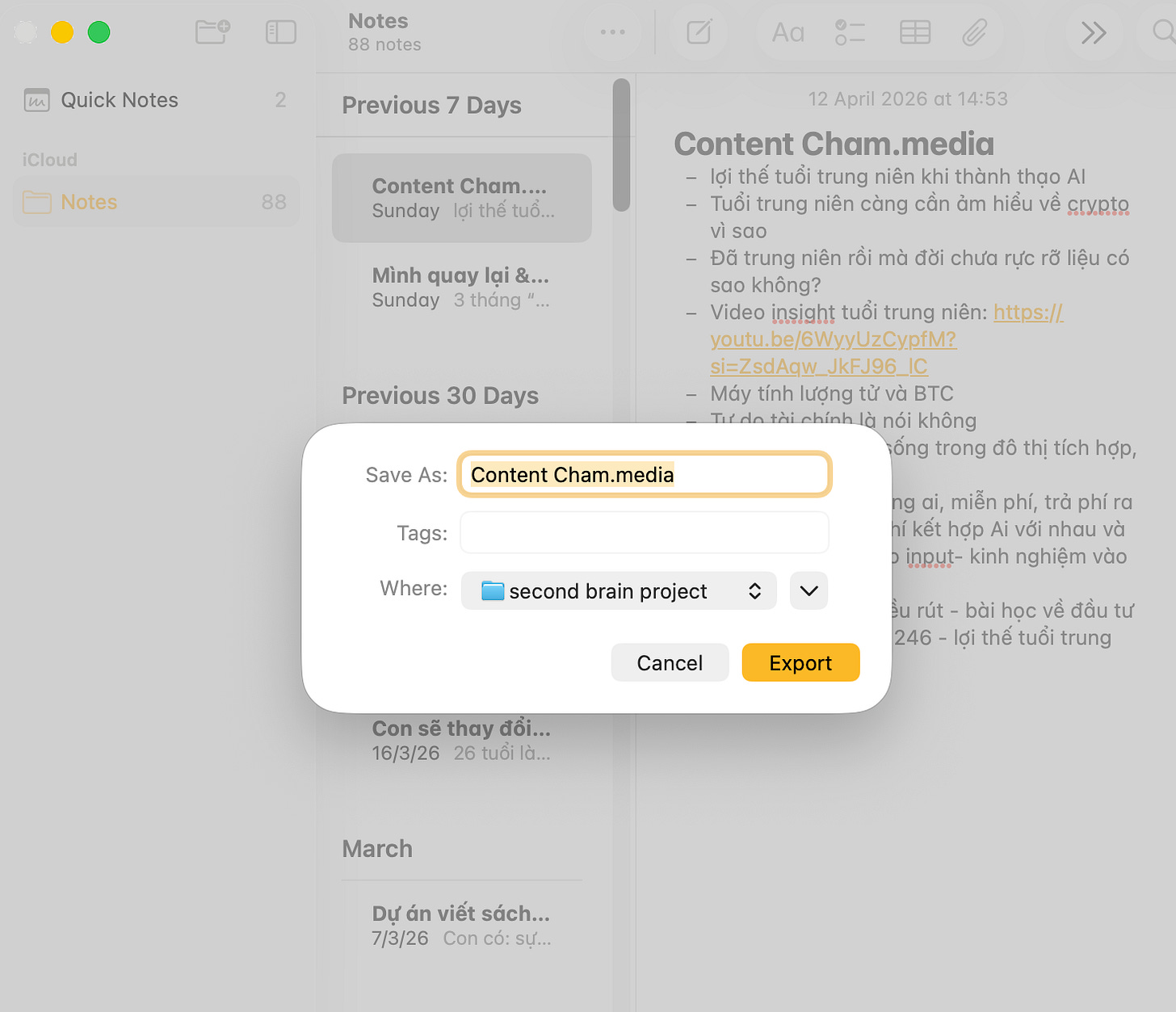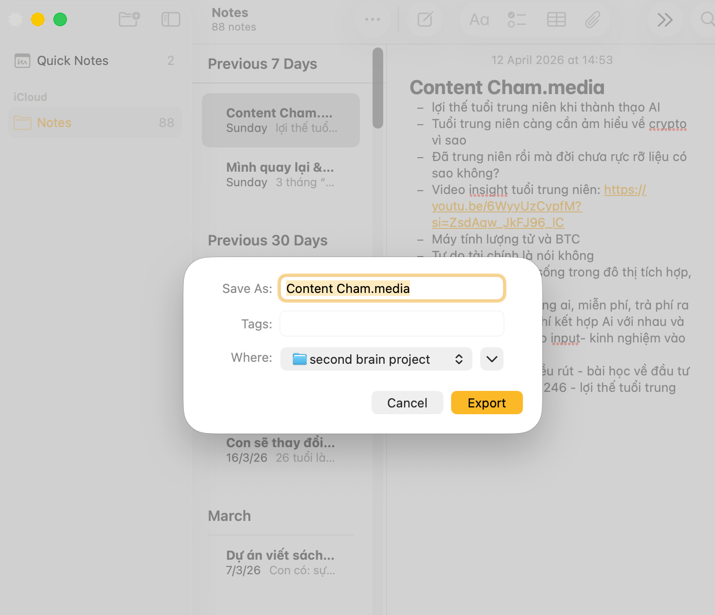 Từ ghi chú sẵn có: Export các note quan trọng từ Apple Notes, Notion, hay bất kỳ ứng dụng nào bạn đang dùng ra file “.md” và bỏ vào thư mục “raw/”. Nếu dùng bạn Notion, export ra CSV cũng được