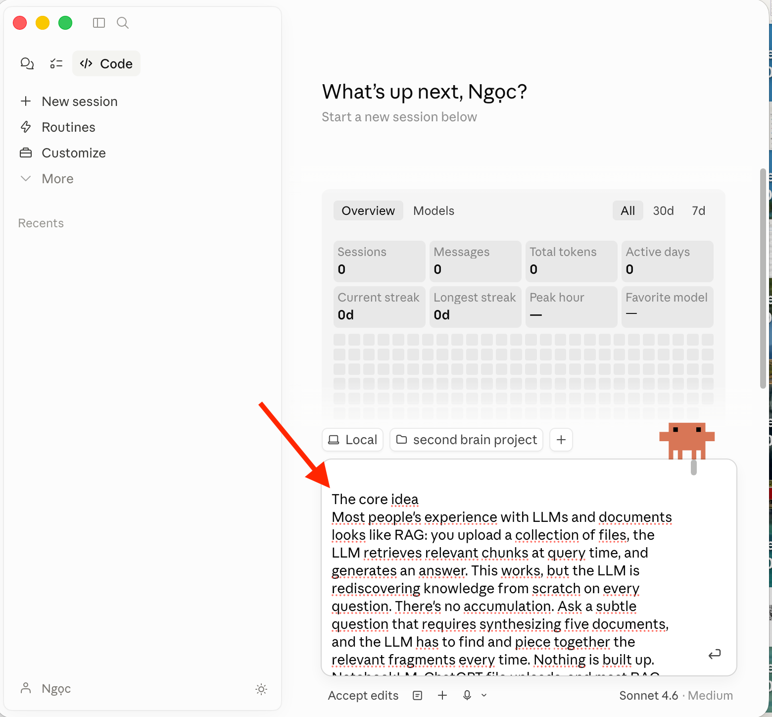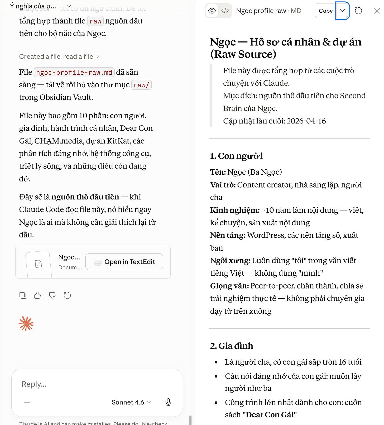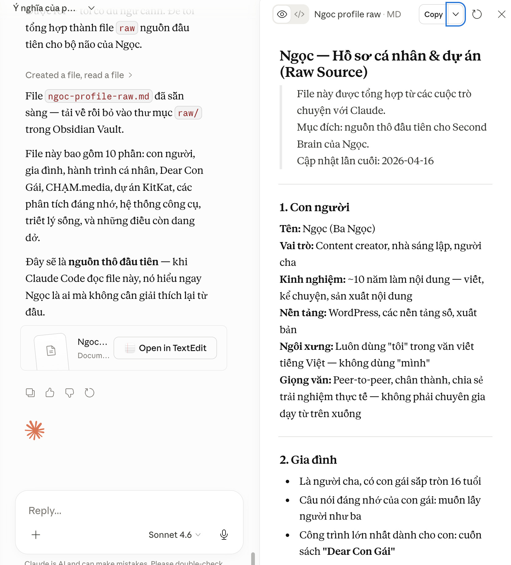 Từ cuộc trò chuyện với AI: Tôi nhờ Claude chat tổng hợp tất cả những gì tôi đã chia sẻ trong các cuộc trò chuyện trước đây, thông tin cá nhân, hành trình, dự án, giọng văn thành một file “ngoc-profile-raw.md”. File này trở thành nguồn thô đầu tiên và quan trọng nhất, vì khi Claude đọc nó, nó hiểu ngay tôi là ai mà không cần tôi giải thích lại từ đầu.