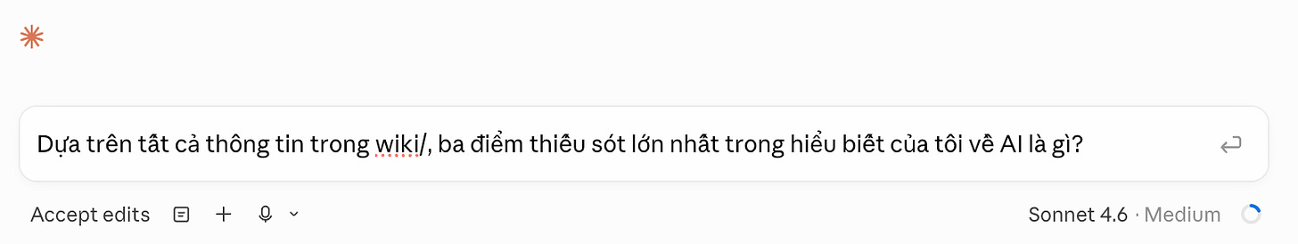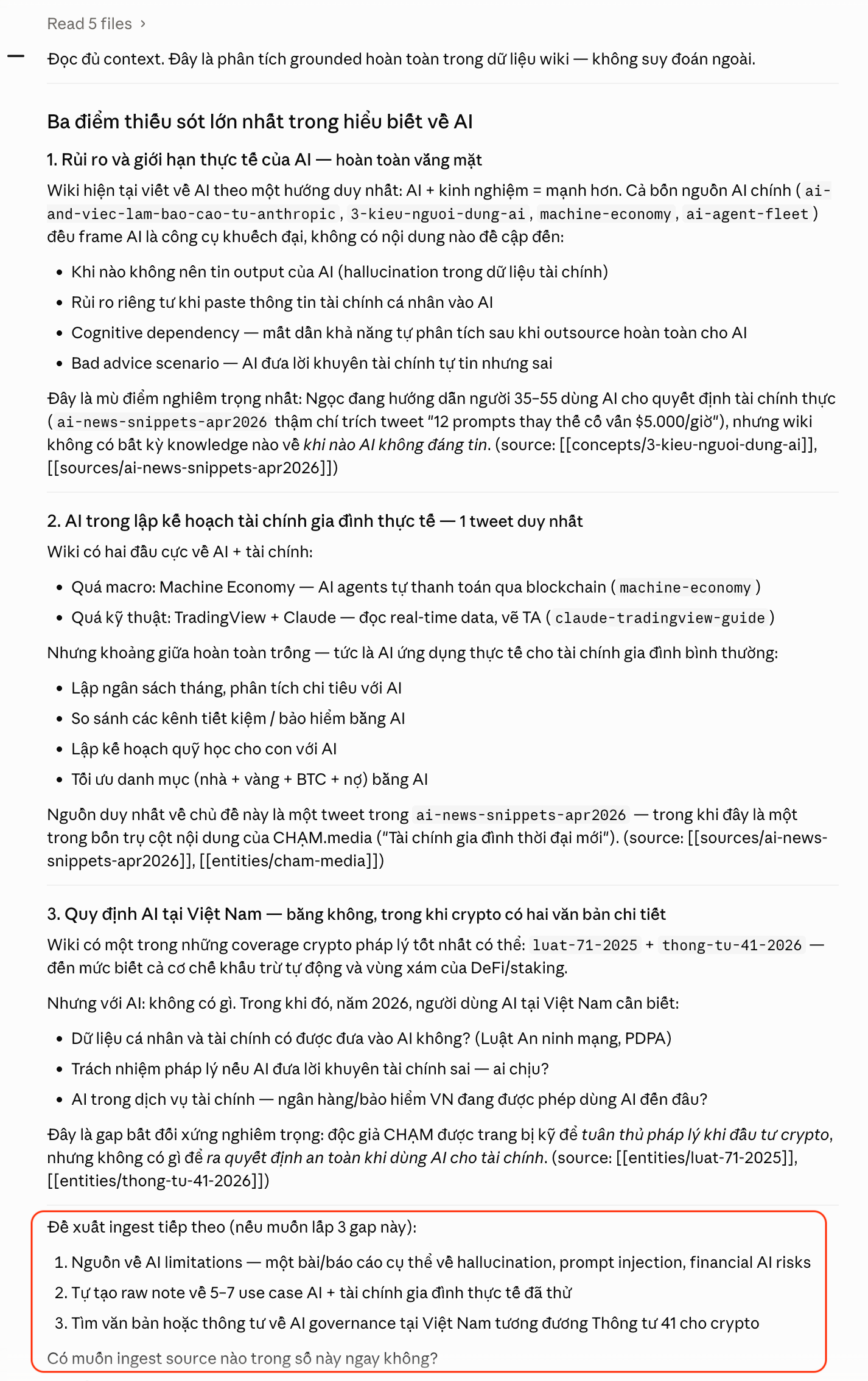 Tôi đã thử với prompt: “Dựa trên tất cả thông tin trong wiki/, ba điểm thiếu sót lớn nhất trong hiểu biết của tôi về [chủ đề] là gì?