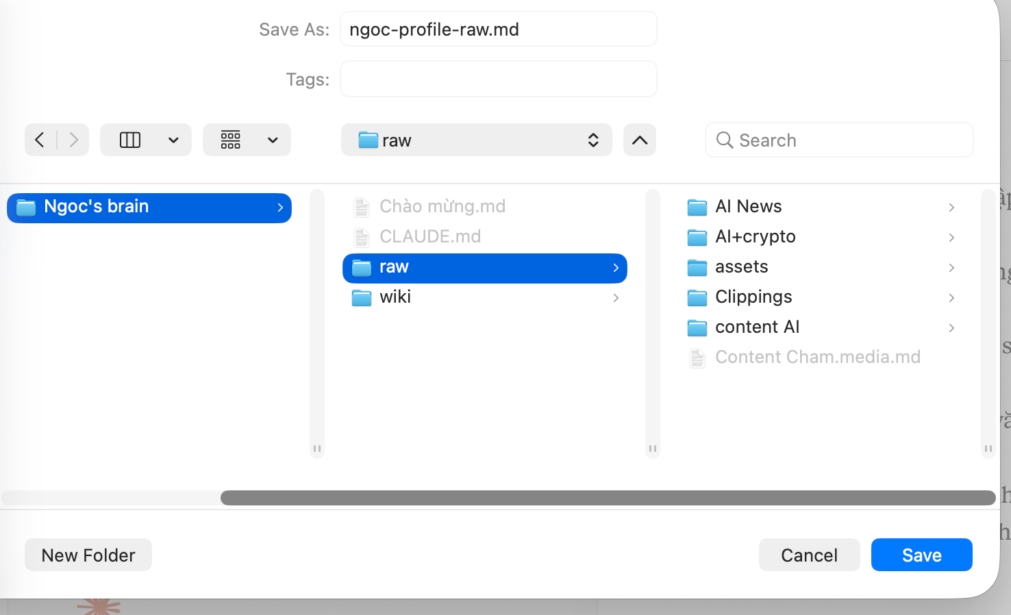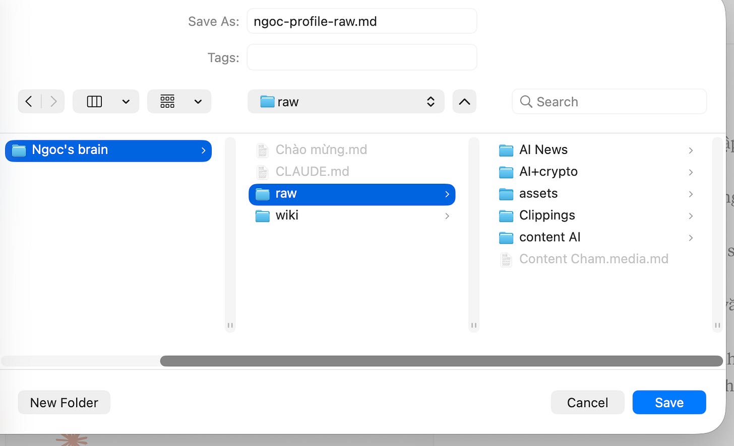 Tôi tải xuống file “ngoc-profile-raw.md” vào thẳng thư mục “raw/”: