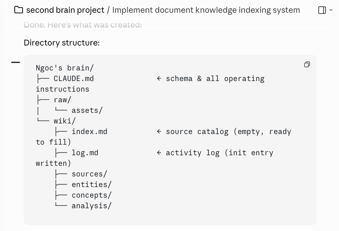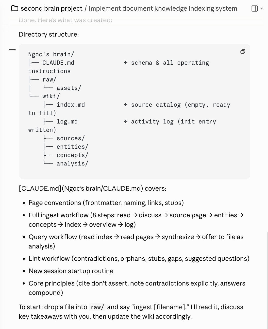 Prompt này hướng dẫn Claude hoạt động như một wiki maintainer có kỷ luật mô tả cách tổ chức wiki, cách xử lý tài liệu mới, cách trả lời câu hỏi dựa trên wiki thay vì tự suy luận. Đây chính là thứ biến Claude từ chatbot thông thường thành người quản lý bộ não cho bạn.