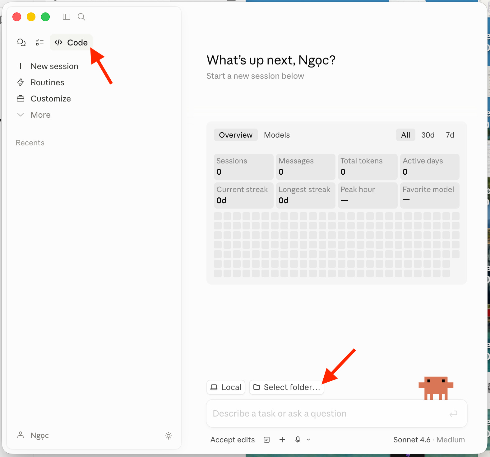Mở Claude Code (desktop app). Ở màn hình chính, click “Select Folder” và chọn thư mục vault Obsidian vừa tạo