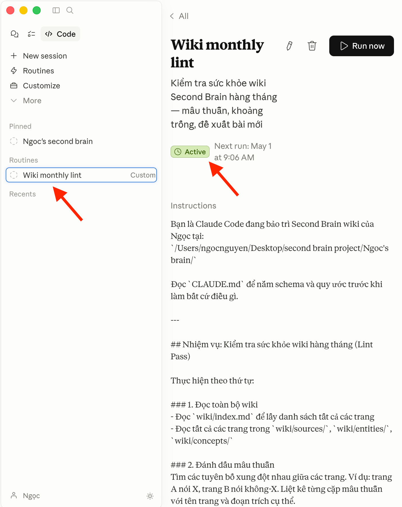 Cá nhân tôi thì tạo hẳn một tác vụ bảo trì & lên lịch tự động qua chức năng “Routines” của Claude Code. Tác vụ này được chạy tự động vào ngày 1 hàng tháng. Như vậy bộ não thứ 2 của tôi luôn được “nuôi dưỡng & làm mới”