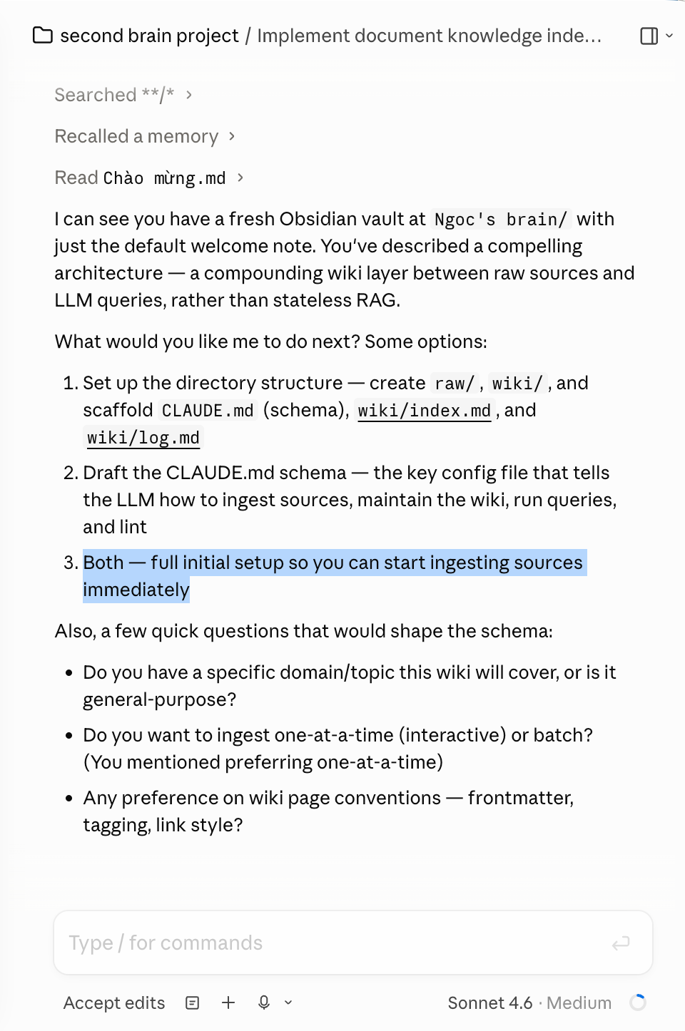Sau khi gửi, Claude đọc vault (hiện còn trống) và hỏi bạn muốn làm gì. Chọn “Both” để thiết lập cấu trúc thư mục đầy đủ. Claude sẽ tự tạo ngay: file CLAUDE.md (schema hướng dẫn), thư mục `raw/` (chứa tài liệu nguồn của bạn), thư mục `wiki/` (nơi AI tạo và quản lý — với index.md, log.md, và các subfolder).
