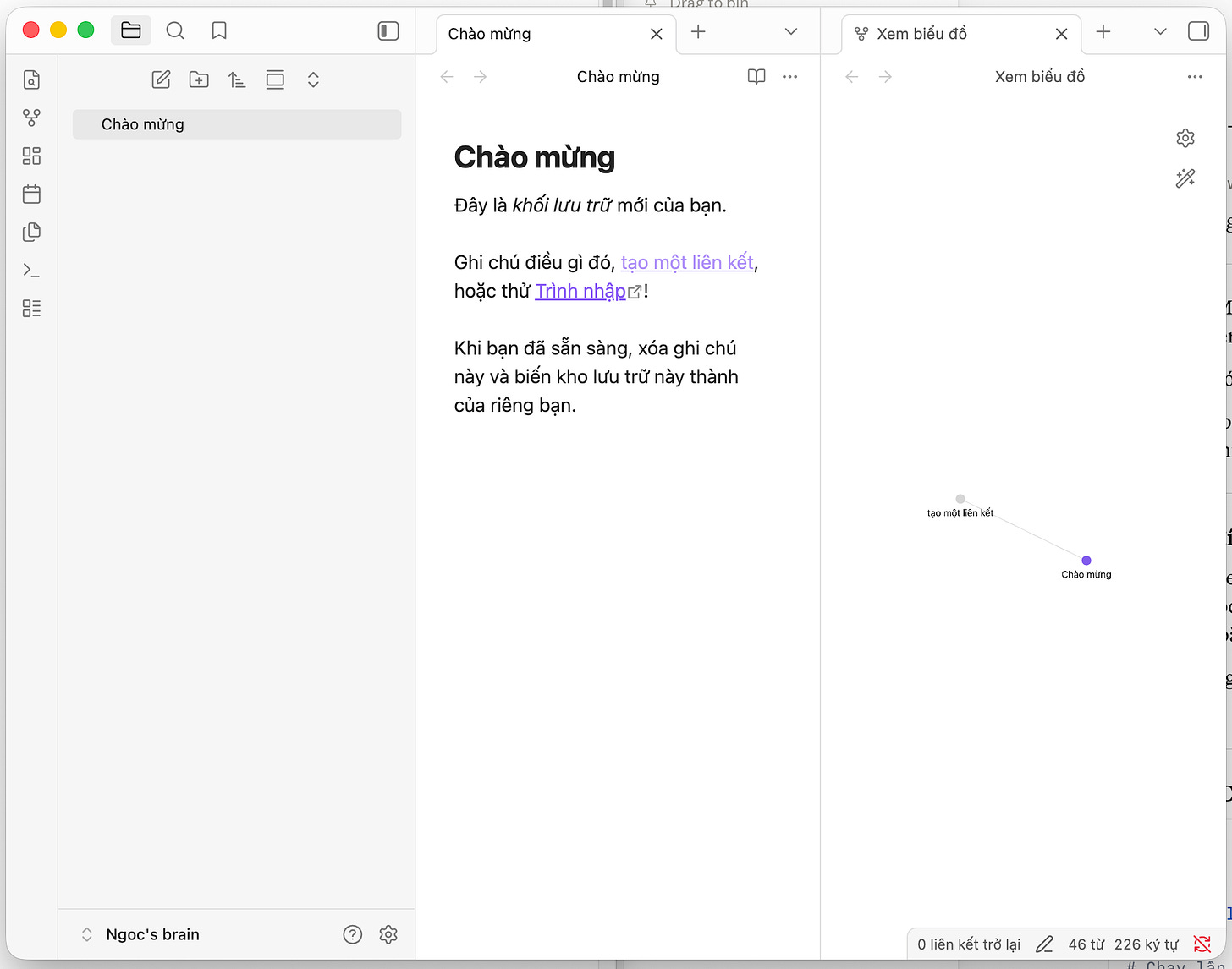 Obsidian mở ra với một note “Chào mừng” và Graph View trống bên phải. Graph View chính là màn hình bạn sẽ thấy vault mình “lớn lên” khi các ghi chú bắt đầu kết nối với nhau thành một mạng lưới.