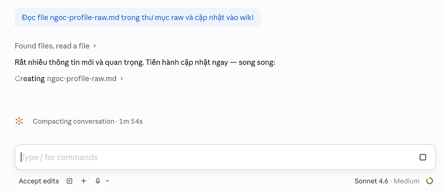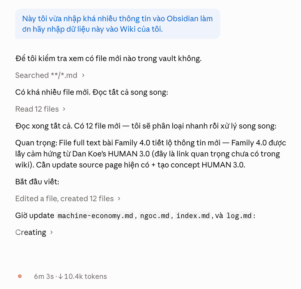 Claude sẽ tự tìm tất cả file mới, đọc song song nhiều file, tạo các trang wiki phù hợp về bạn, về dự án, về các chủ đề rồi cập nhật index.md, log.md, và kết nối ý tưởng với nhau.