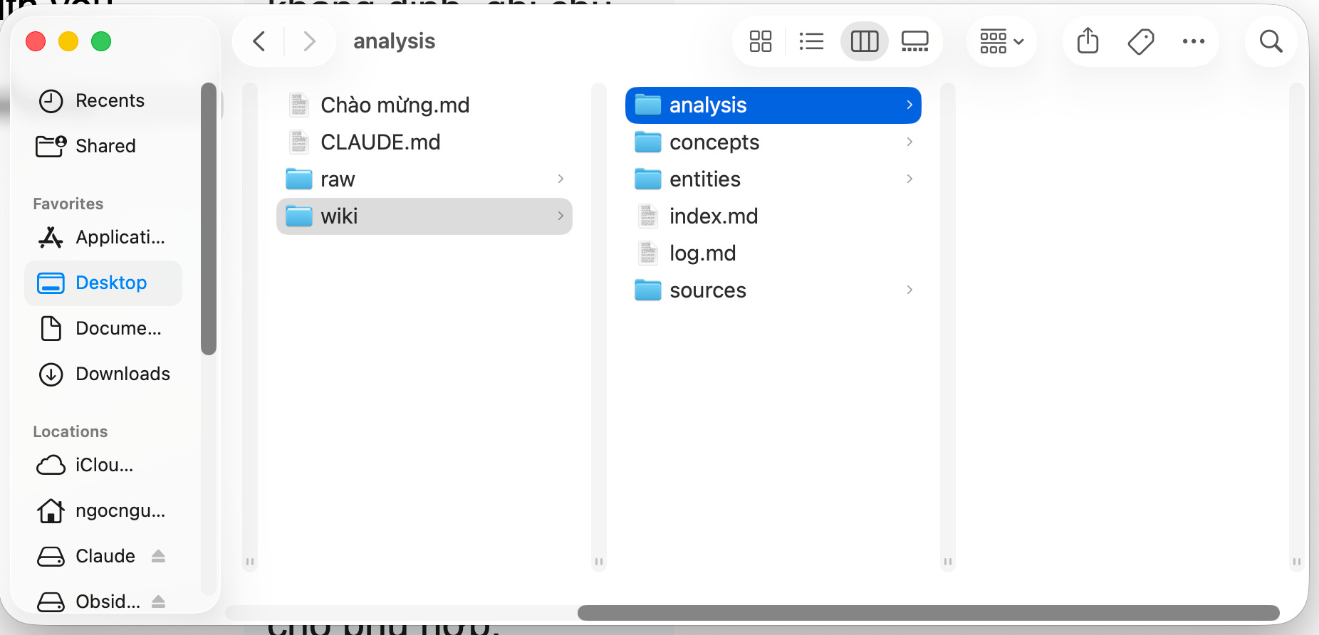 Khi bạn cài đặt, Obsidian (ứng dụng ghi chú và quản lý tri thức cá nhân) chứa cả ba lớp này. Claude sẽ được kết nối với thư mục vault, đóng vai trò người quản lý và mở rộng wiki theo thời gian.