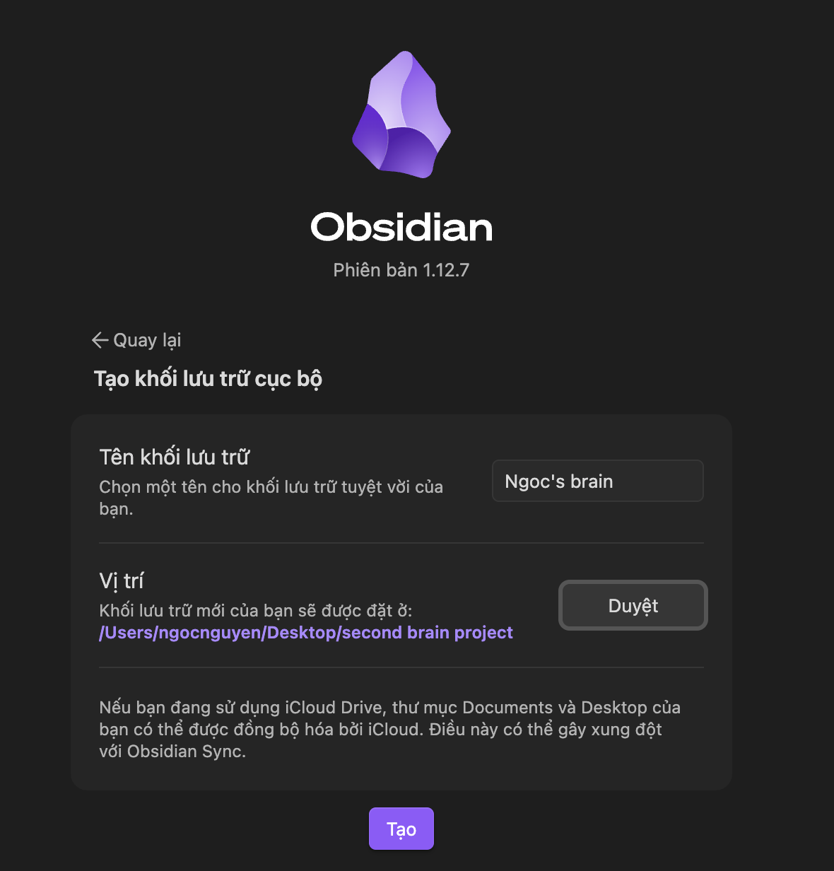 Sau khi cài, bạn thấy màn hình chọn vault. Chọn “Tạo khối lưu trữ mới”. Đặt tên gì cũng được, vault của tôi tên là “Ngoc’s brain”. Chọn thư mục bạn muốn lưu, tôi thì đặt vị trí lưu trên Desktop cho tiện thao tác.
