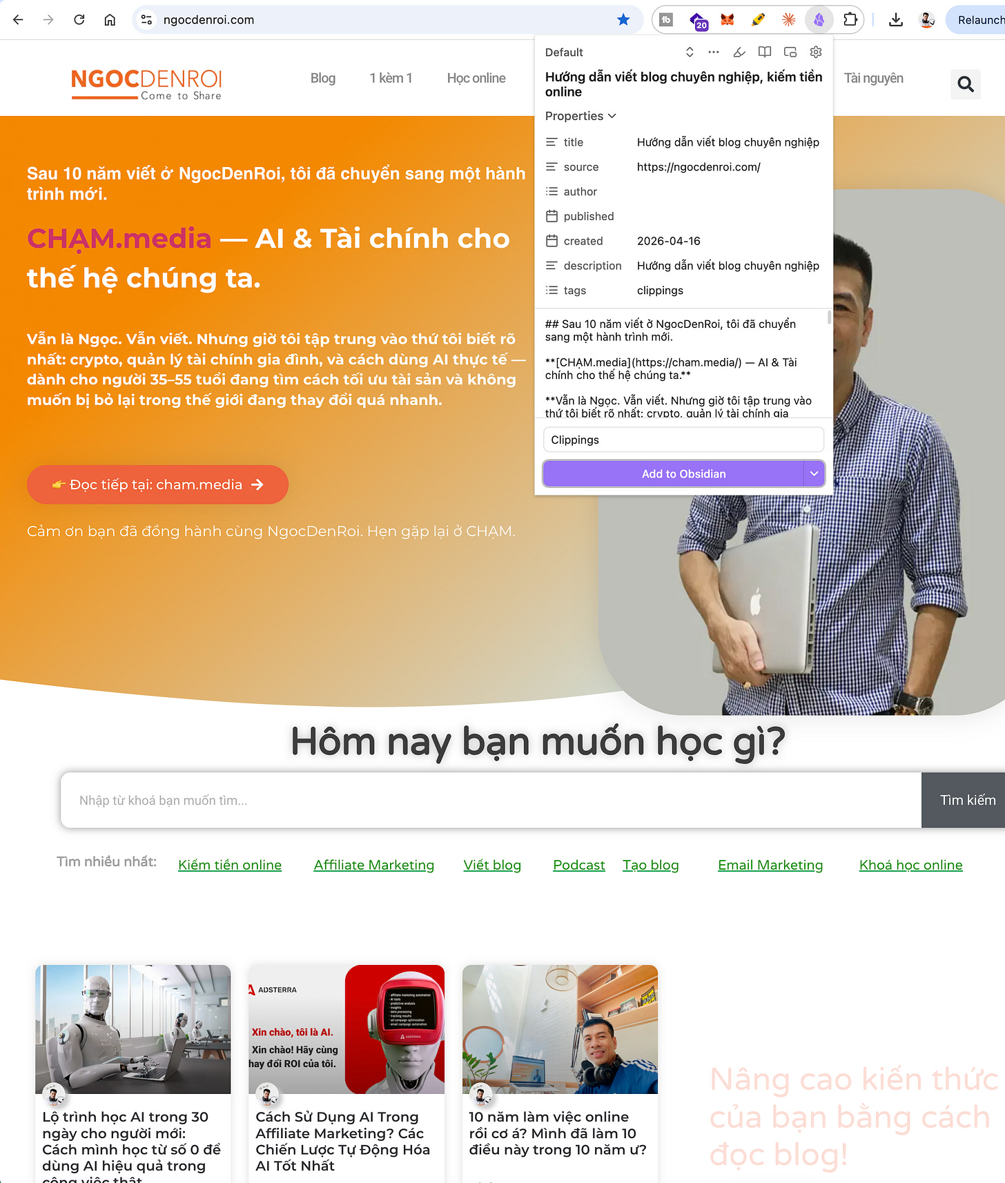 Từ web: Cài Obsidian Web Clipper (extension Chrome miễn phí tại obsidian.md/clipper). Khi đọc bất kỳ bài viết nào, click extension - nó tự chuyển thành markdown và lưu thẳng vào vault. Tôi dùng cái này để clip bài từ ngocdenroi.com (blog tôi đã viết liên tục 10 năm) và các nguồn tôi theo dõi thường xuyên.